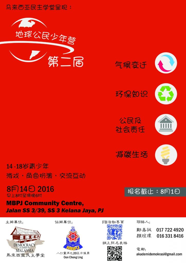 活动的报名截止日期为2016年7月30日,欢迎各位有兴趣的中学生踊跃报名。欲知更多详情,欢迎联络第二届地球公民少年营 主席嘉诚017-7224920、副主席萱栗016-3318416 或电邮akademidemokrasi@gmail.com查询。