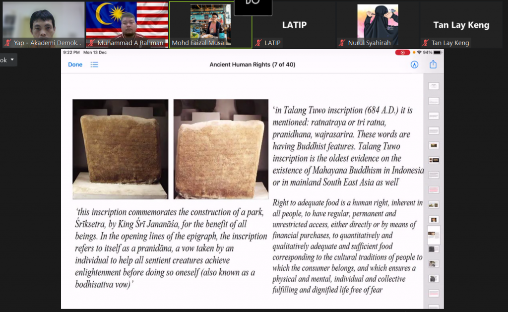 (13 Disember, 2021) Dalam kuliah awam bertajuk Hak Asasi Manusia dan Alam Melayu malam ini, Dr. Mohd Faizal Musa menerangkan unsur-unsur hak asasi manusia dalam bahan-bahan bersejarah di zaman Srivijaya dan bagaimana ajaran Buddhisme memberi pengaruh kepadanya.