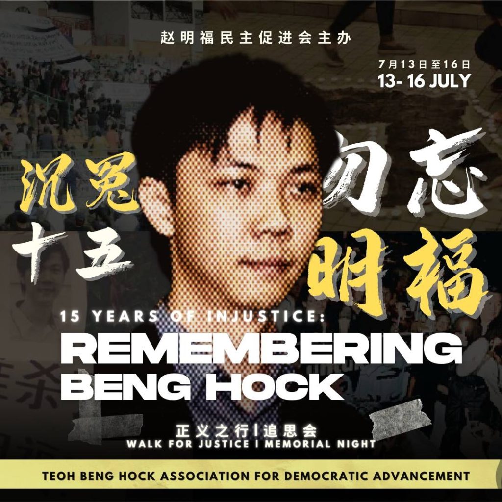 Besides, in collaboration with KLSCAH Youth and Eliminating Deaths and Abuse in Custody Together (EDICT), we will organise a memorial ceremony for victims of death in custody at the bridge near the Bar Council on 16th July, at 6 pm. Later at 8 pm, a memorial service commemorating the 15th anniversary of Teoh Beng Hock’s passing will be held in the Tan Sri Ngan Ching Wen Hall. The public is invited to attend both events.